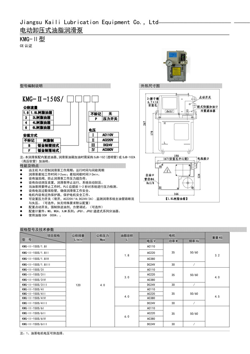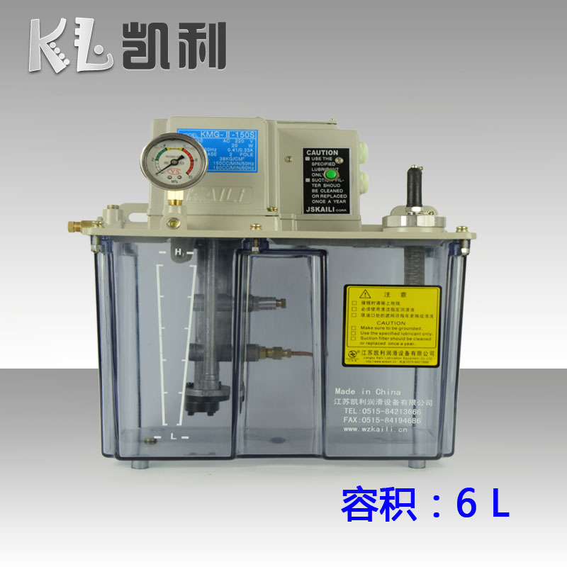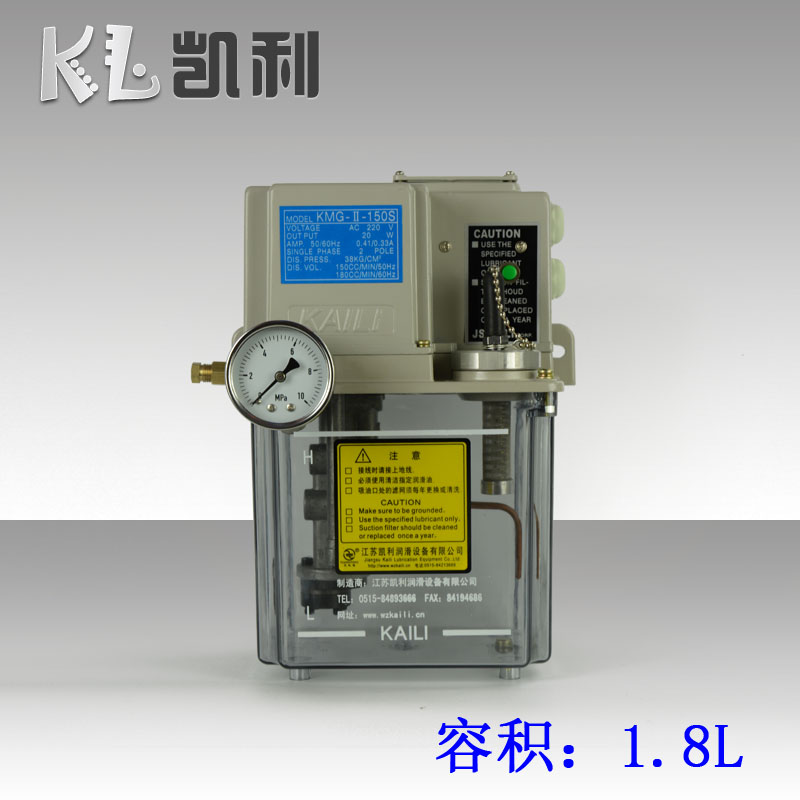 KMO-II-150S型電動潤滑泵是AMO-II-150S型的升級改進版產(chǎn)品。潤滑泵的油路設(shè)計也做了改進性能更穩(wěn)定。油箱的容積為1.8L、3L、4L、5L采用德國原裝材料被美譽為透明金屬?蛻羧绻箐撝柒k金油箱可根據(jù)要求定做,該泵是一款自動抵抗式集中潤滑系統(tǒng)配置的產(chǎn)品,潤滑泵的電壓有AC110V和AC220V可滿足不同客戶需求提供更多選擇。間隔潤滑時間可以在設(shè)備的PC系統(tǒng)上根據(jù)實際需要設(shè)定,油泵設(shè)有低油位報警信號輸出和失壓報警信號輸出。該泵與MO系列容積加壓式式計量件、XJM系列容積加壓式式計量件(整體鋁合金設(shè)計無需連接體)FX-1型濾油器、F-3D型濾油器、PV、JV系列連接體。等管接件配套使用組成對機械設(shè)備定時定量自動集中潤滑為您的設(shè)備,降低油耗、提高使用壽命、提高加工精度、降低故障率、為您的設(shè)備保駕護航。也可致電我公司咨詢0515-84213666或者13770139320----QQ598425079我們將以最專業(yè)和 質(zhì)的技術(shù)服務(wù),可為客戶提供量身定做設(shè)計集中潤滑系統(tǒng)方案。