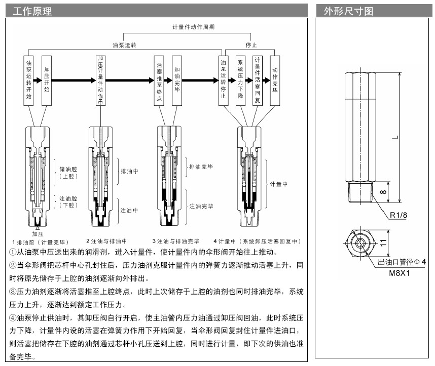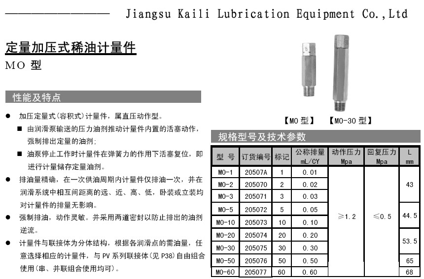 MO系列容積加壓式計量件可與KMO系列電動稀油潤滑泵和QRB系列氣動潤滑泵配套使用配套使用,適用大中小型設備的集中潤滑,本產(chǎn)品可點定時定量計量 對潤滑點供油,而且出有壓力高,特別對距離較遠的潤滑點能夠做到遠距離供油。主要技術指標和訂貨選型可參照樣本27頁,如沒有產(chǎn)品樣本可在本公司官方網(wǎng)站下載電子版樣本。配套件FX-1型濾油器、F-3D型濾油器、PV、JV系列連接體。等管接件配套使用組成對機械設備定時定量自動集中潤滑為您的設備,降低油耗、提高使用壽命、提高加工精度、降低故障率、為您的設備保駕護航。也可致電我公司咨詢0515-84213666或者13770139320----QQ598425079我們將以最專業(yè)和 質(zhì)的技術服務,可為客戶提供量身定做設計集中潤滑系統(tǒng)方案。