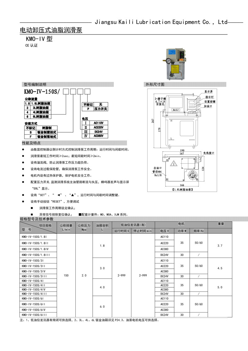 KMO-IV-150S型電動潤滑泵是AMO-IV-150S型的升級改進(jìn)版產(chǎn)品。潤滑泵的油路設(shè)計(jì)也做了改進(jìn)性能更穩(wěn)定。油箱的容積為1.8L、3L、4L、5L采用德國原裝材料被美譽(yù)為透明金屬?蛻羧绻箐撝柒k金油箱可根據(jù)要求定做,該泵是一款自動抵抗式集中潤滑系統(tǒng)配置的產(chǎn)品,潤滑泵的電壓有AC110V和AC220V可滿足不同客戶需求提供更多選擇。間隔潤滑時(shí)間可以在設(shè)備的PC系統(tǒng)上根據(jù)實(shí)際需要設(shè)定,油泵設(shè)有低油位報(bào)警信號輸出和失壓報(bào)警信號輸出。該泵與MO系列容積加壓式式計(jì)量件、XJM系列容積加壓式式計(jì)量件(整體鋁合金設(shè)計(jì)無需連接體)FX-1型濾油器、F-3D型濾油器、PV、JV系列連接體。等管接件配套使用組成對機(jī)械設(shè)備定時(shí)定量自動集中潤滑為您的設(shè)備,降低油耗、提高使用壽命、提高加工精度、降低故障率、為您的設(shè)備保駕護(hù)航。也可致電我公司咨詢0515-84213666或者13770139320----QQ598425079我們將以最專業(yè)和 質(zhì)的技術(shù)服務(wù),可為客戶提供量身定做設(shè)計(jì)集中潤滑系統(tǒng)方案。 |