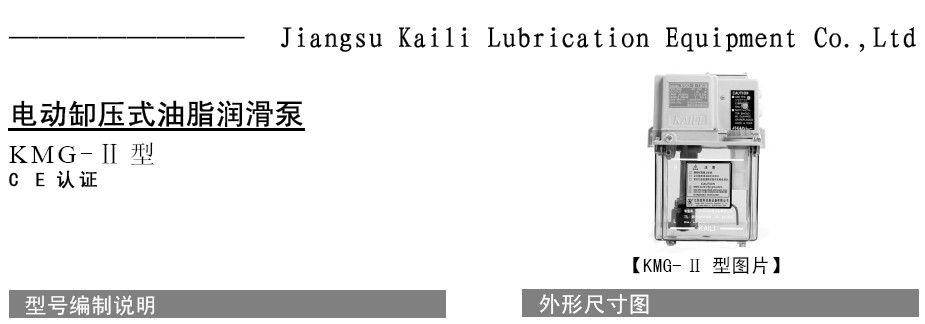 KMG-II-120型電動潤滑泵是我公司 研發(fā)的專利產(chǎn)品。油箱的容積為1.8L、3L、4L、5L采用德國原裝材料被美譽為透明金屬?蛻羧绻箐撝柒k金油箱可根據(jù)要求定做,該泵是一款自動抵抗式集中潤滑系統(tǒng)配置的產(chǎn)品,潤滑泵的電壓有AC110V和AC220V可滿足不同客戶需求提供更多選擇。間隔潤滑時間可以在設(shè)備的PC系統(tǒng)上根據(jù)實際需要設(shè)定,油泵設(shè)有失壓報警信號輸出。該泵與MG系列和XMB系列容積加壓式式計量件、XMB系列容積加壓式式計量件(整體鋁合金設(shè)計無需連接體)、LYQ8型濾油器、FX-3G濾油器、FX-5濾油器、PV、JV系列連接體。等管接件配套使用組成對機械設(shè)備定時定量自動集中潤滑為您的設(shè)備,降低油耗、提高使用壽命、提高加工精度、降低故障率、為您的設(shè)備保駕護航。也可致電我公司咨詢0515-84213666或者13770139320----QQ598425079我們將以最專業(yè)和 質(zhì)的技術(shù)服務(wù),可為客戶提供量身定做設(shè)計集中潤滑系統(tǒng)方案。詳情了解和訂貨可參照樣本33頁,沒有樣本可到我公司官方網(wǎng)站下載。