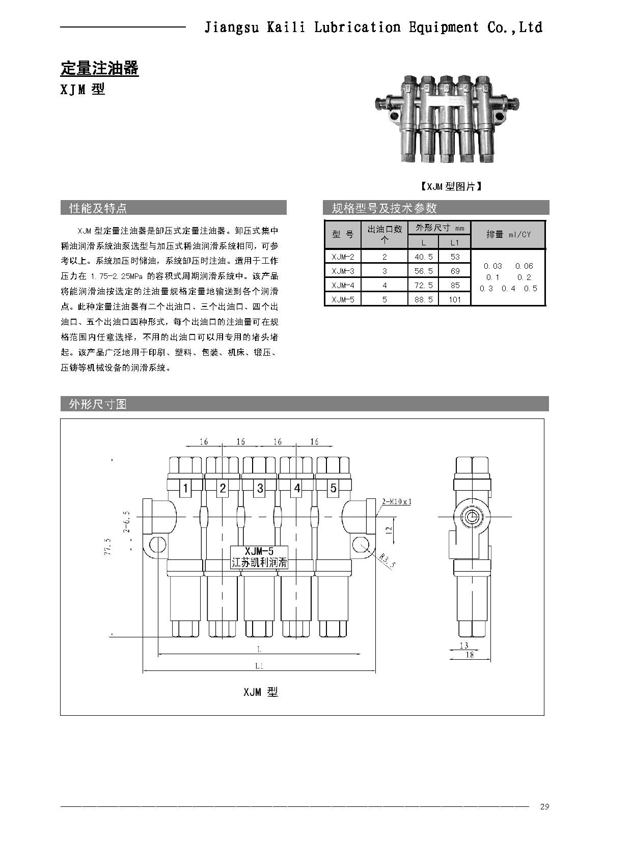 XJM系列為容積卸壓式注油器本產(chǎn)品為整體壓鑄成型無需連接體進行組裝,計量 有多種規(guī)格的排量供客戶選擇,可以適用于稀油也可用000號、00號、0號、1號、油脂。特別適用于封閉的潤滑點,也可根據(jù)需要和MO系列和XMB系列計量件搭配使用。集中潤滑的油泵有KMO稀油潤滑泵系列、KMG油脂潤滑泵系列、GHS手動潤滑泵等帶卸壓功能的潤滑泵,配套使用組成對機械設備定時定量自動集中潤滑為您的設備,降低油耗、提高使用壽命、提高加工精度、降低故障率、提高效能、為您的設備精心呵護保駕護航。也可致電我公司咨詢0515-84213666或者13770139320----QQ598425079我們將以最專業(yè)和 質的技術服務,可為客戶提供量身定做設計集中潤滑系統(tǒng)方案。