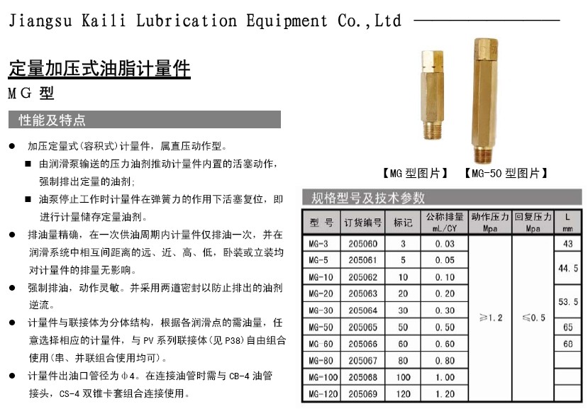 MG系列容積加壓式油脂計(jì)量件可與KMG系列電動(dòng)油脂潤滑泵和QRB系列氣動(dòng)潤滑泵配套使用配套使用,適用大中小型設(shè)備的集中潤滑,本產(chǎn)品可點(diǎn)定時(shí)定量計(jì)量 對(duì)潤滑點(diǎn)供油,而且出有壓力高,特別對(duì)距離較遠(yuǎn)的潤滑點(diǎn)能夠做到遠(yuǎn)距離供油。主要技術(shù)指標(biāo)和訂貨選型可參照樣本36頁,如沒有產(chǎn)品樣本可在本公司官方網(wǎng)站下載電子版樣本。配套件FX-1型濾油器、F-3D型濾油器、LV、PV、JV系列連接體。等管接件配套使用組成對(duì)機(jī)械設(shè)備定時(shí)定量自動(dòng)集中潤滑為您的設(shè)備,降低油耗、提高使用壽命、提高加工精度、降低故障率、為您的設(shè)備保駕護(hù)航。也可致電我公司咨詢0515-84213666或者13770139320----QQ598425079我們將以最專業(yè)和 質(zhì)的技術(shù)服務(wù),可為客戶提供量身定做設(shè)計(jì)集中潤滑系統(tǒng)方案。